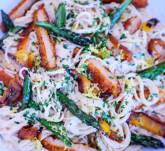 FRESH CREAMY ROASTED TOMATO AND RED PEPPER ANGEL HAIR PASTA WITH ROASTED GARLIC AND MUSHROOMS
